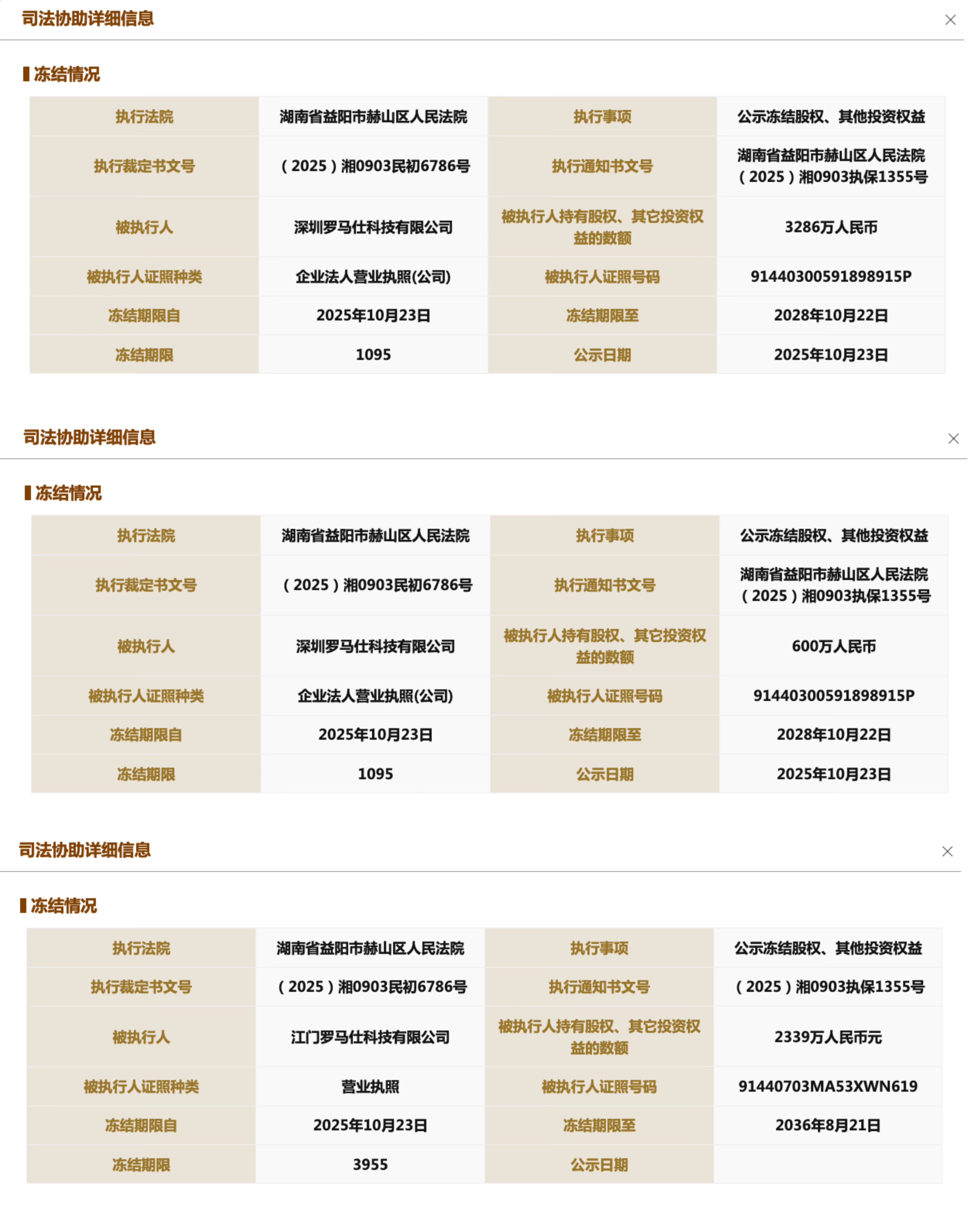 今年9月,江门罗马仕科技有限公司所持江门惠比寿电子科技有限公司210万元人民币股权被广东省东莞市第三人民法院冻结、2313.15405万元人民币股权被广东省江门市蓬江区人民法院冻结。同时,深圳罗马仕科技有限公司所持江门罗马仕科技公司175.88万元人民币被深圳市南山区人民法院冻结。