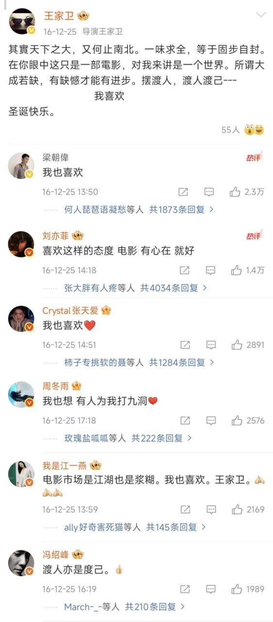 彼时,身为创作者的王家卫主动站队,高高在上地甩出一句“我喜欢”,圈内人立马千呼百应,大大小小的演员纷纷在这条博文下留言表示支持,自娱自乐的狂欢就此拉开序幕。