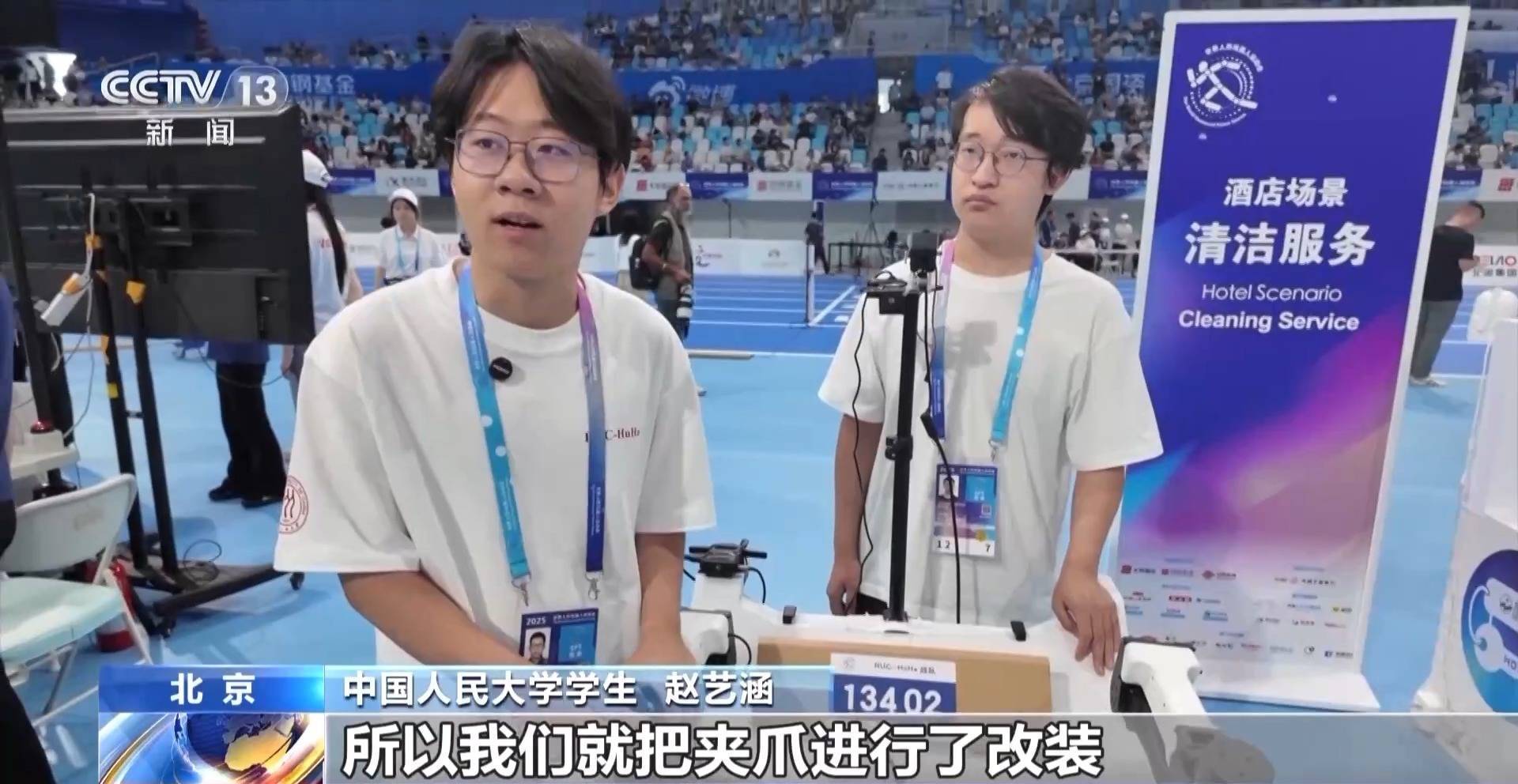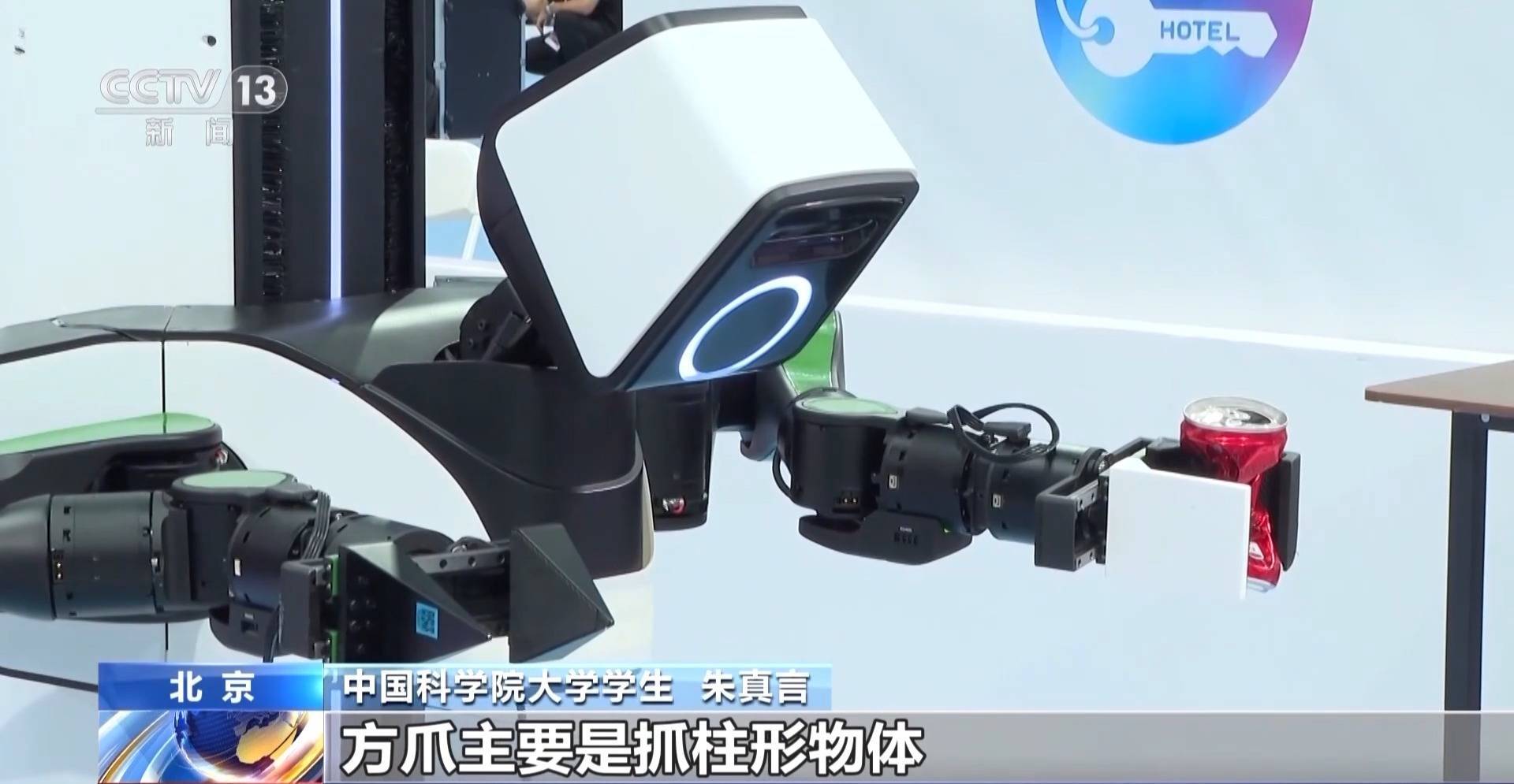 r中国人民大学学生 赵艺涵:有一些电视柜可能比较矮,我们机器人的臂展不是很长,所以我们就把夹爪进行了改装,把它延长了一下。