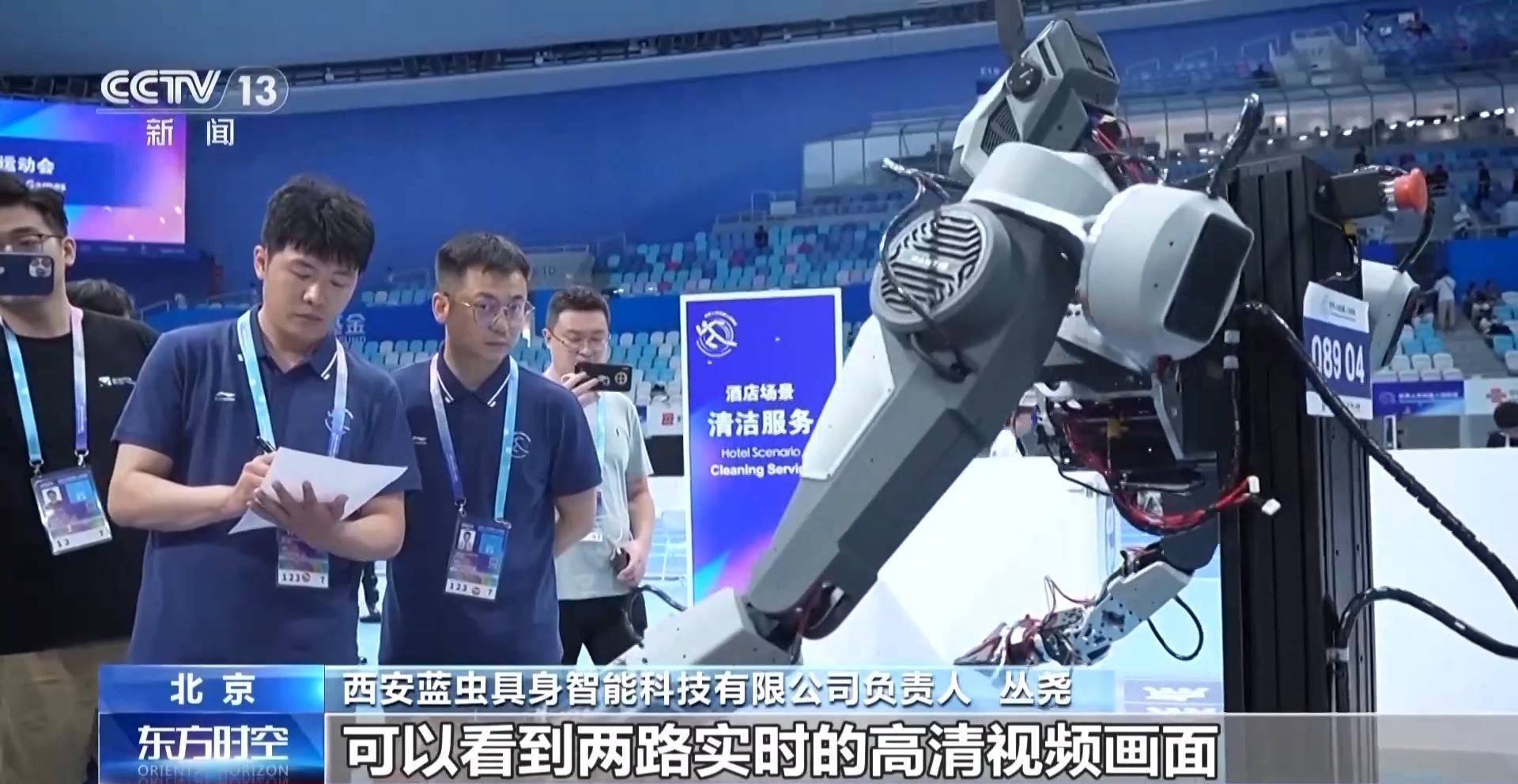 西安蓝虫具身智能科技有限公司负责人 丛尧:我们双目摄像头可以看到两路实时的高清视频画面,这样在操作员眼睛里能够看到一个三维立体、有深度的视觉。据我了解,这个和其他队伍采用平面视频的方案有很大区别。平面对于操作员来讲,会增加很多操作障碍。