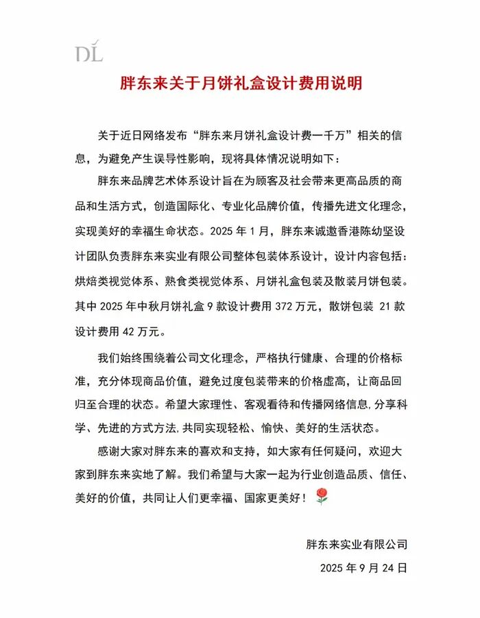 胖东来品牌艺术体系设计旨在为顾客及社会带来更高品质的商品和生活方式,创造国际化、专业化品牌价值,传播先进文化理念,实现美好的幸福生活状态。2025年1月,胖东来诚邀香港陈幼坚设计团队负责胖东来实业有限公司整体包装体系设计,设计内容包括:烘焙类视觉体系、熟食类视觉体系、月饼礼盒包装及散装月饼包装。其中2025年中秋月饼礼盒9款设计费用372万元,散饼包装21款设计费用42万元。